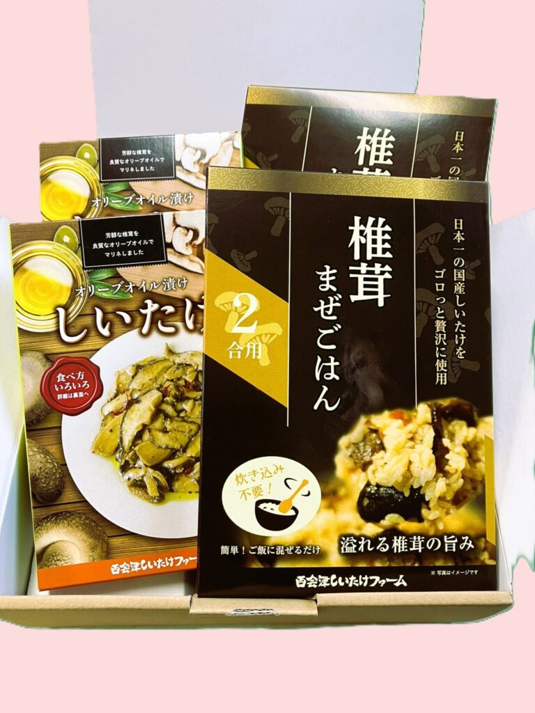西会津しいたけファーム自慢の美味しい生椎茸の旨味を凝縮した乾燥しいたけを使った「混ぜご飯の素2合用」と、フレンチシェフ考案の「オリーブオイル漬しいたけ」をそれぞれ2個ずつセットにしました。